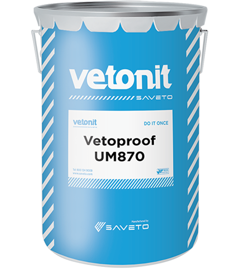 Vetoproof UM870 is a premium quality single-component high viscous polyurethane waterproofing membrane; the product is a cold liquid applied that cures by reaction with atmospheric moisture to form a highly elastic rubbery jointless waterproofing membrane.