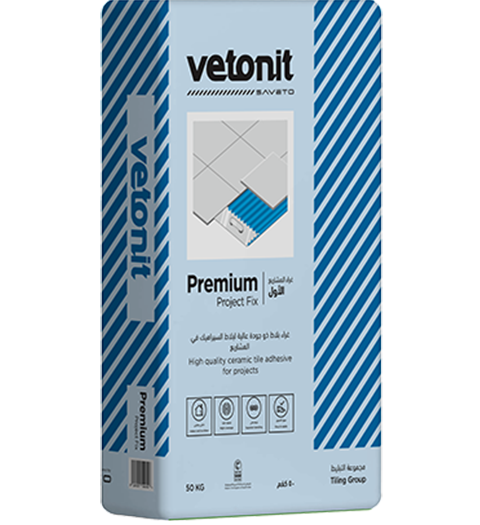 Premium Project Fix is a normal cementitious adhesive with slip resistance composed of hydraulic binders, selected aggregates, and special additives. It is supplied as a dry powder in pre-weighed bags ready to use on-site, which requires only the addition of clean water to produce easily workable mortar. Premium Project Fix is ideal for fixing Ceramic Tiles and Terrazzo Tiles. Premium Project Fix is applied in thickness from 3mm to 10mm, depending upon the substrate’s type of tiles and quality. Premium Project Fix is available in white and grey colors.