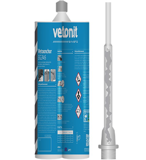 Vetoanchor EG346 is a two-component, styrene-free, pure epoxy-based, high-strength adhesive anchoring system. The system includes injection adhesive in plastic cartridges, mixing nozzles, dispensing tools, and hole cleaning equipment. The product is designed for bonding threaded rod and reinforcing bar hardware into drilled holes in the concrete base and solid masonry materials. Vetoanchor EG346 is available in two packaging twin cartridge systems: 400 milliliters side-by-side cartridges that require a specifically designed injection gun.