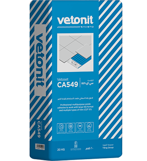 Vetoset CA549 is a cement based professional grade highly deformable tile adhesive that works with most types of tiles and flexible substrates. The product is composed of a blend of cement, carefully selected aggregates, special additives, and polymers that provide Vetoset CA549 with its unique properties. The product is suitable for internal as well as external use.